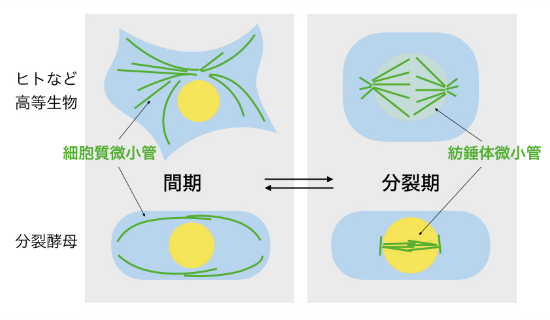間期には細胞質に網目状の微小管が形成されるが、分裂期にはこれが消失し、紡錘体へと再編成される。我々はその再編成の分子メカニズムを研究対象としている。