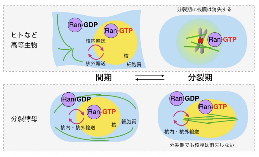 我々は、酵母では分裂期でも核膜が消失しないため、分裂期の開始とともにRanが微小管形成を誘導する因子を核内に蓄積させることで、核内での紡錘体形成を促進すると考えました (図3-2) 。酵母ではRanが微小管形成を促進する必要があったといえます。このような酵母においてRanの役割がうまれ、これが起源となり、種の進化とともに核膜が消失するようになったあとでもRanの微小管促進機能がそのまま利用されていると想像できます。