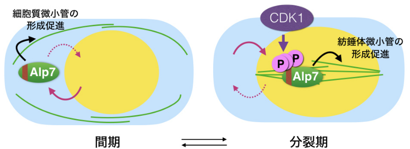 (左) 間期の分裂酵母細胞では微小管結合タンパク質Alp7は核と細胞質間を行き来しているが、核に移行しても核外に排出されて主に細胞質に局在し、その結果、細胞質微小管の形成を促進する。 (右) G2期から分裂期に突入する際に、Alp7はサイクリン依存性キナーゼCDK1によるリン酸化を受けて核に蓄積する。このように微小管の再編成にはAlp7の局在変化が重要な役割を果たす。