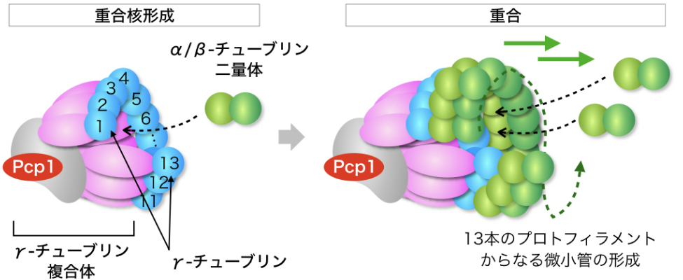 γ-チューブリン複合体には、γ-チューブリンの他にGCP2、GCP3などの構成タンパク質が含まれる。これらが13分子のγ-チューブリンで1周するようなリング状の構造を作り (左) 、γ-チューブリンのとなりにα/β-チューブリン2量体が次々と結合することで重合核が形成され、その後はα/β-チューブリン2量体どうしの会合による重合反応へと引き継がれる (右) 。
