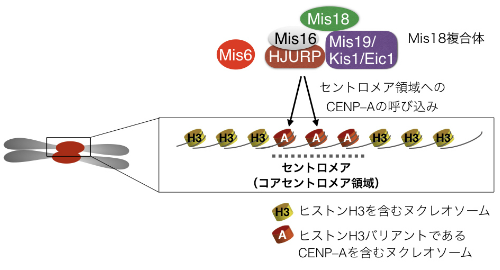 そのMis18複合体の機能ですが、Mis18複合体はヒストンH3のセントロメア特異的バリアントであるCENP-Aタンパク質をセントロメアに呼び込む機能があることが知られています。kis1変異体ではMis18が機能できないためCENP-Aのセントロメアへの結合が著しく低下することが分かりました。Kis1/Mis19/Eic1はMis18複合体の新しく発見された構成因子であるといえます。
