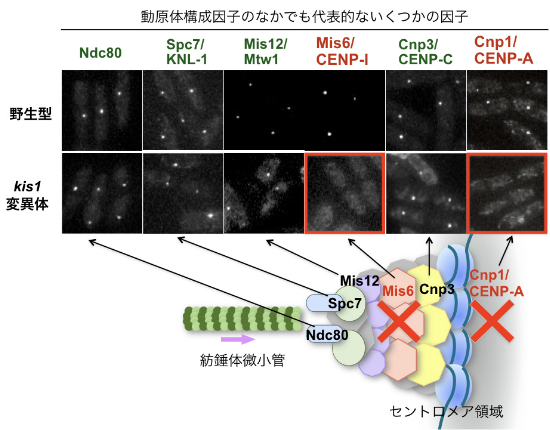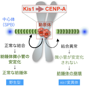 Kis1を含むMis18複合体の働きによりCENP-Aを含むヌクレオソームがセントロメア領域に局在化でき、その結果、動原体と微小管の結合が促進される。結合が起きると微小管の安定化が起きるが、kis1変異体などでこの結合に異常が生じると微小管は安定化されない。そのためkis1変異体では紡錘体が崩壊したと考えられる。
