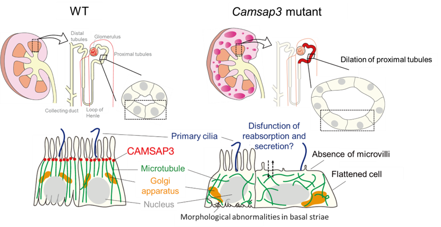 Through the analyses of functions of the CAMSAP3 protein in small intestine, we also found that both kidneys of elderly Camsap3 mutant mice are whitened and enlarged (Mitsuhata et al., Sci. Rep., 2021, also see: Department of Biomedical Sciences, School of Advanced Science and Engineering, Waseda University, Waseda University Research Topics). In young mutant mice, the appearance of the kidneys is similar to that of WT (wild type) kidneys, but when internal tissue sections are examined, numerous cysts are found in the cortical area. We emphasize the following discoveries are particularly of significance: the CAMSAP3 gene is responsible for cystic kidneys and that epithelial microtubules regulated by CAMSAP3 maintain the structure of kidneys.