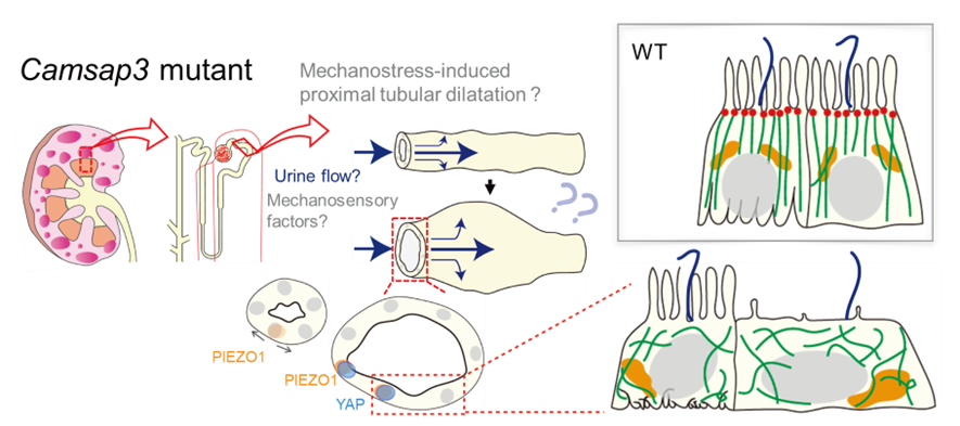 Loss of Camsap3 functions perturbs the microtubule orientation in tubular epithelial cells. Consequently, the force to maintain the cell shape may become weak and therefore cells are unable to resist the pressure by the flow of the primary urine. This causes dilation of proximal tubules, which finally develops into cysts. The pressure of by the primary urine flow activates PIEZO1 and YAP, factors of mechanosensory systems. Because proximal tubules have fewer microtubules than the other tubules do, the effect of loss of Camsap3 might be prominent.