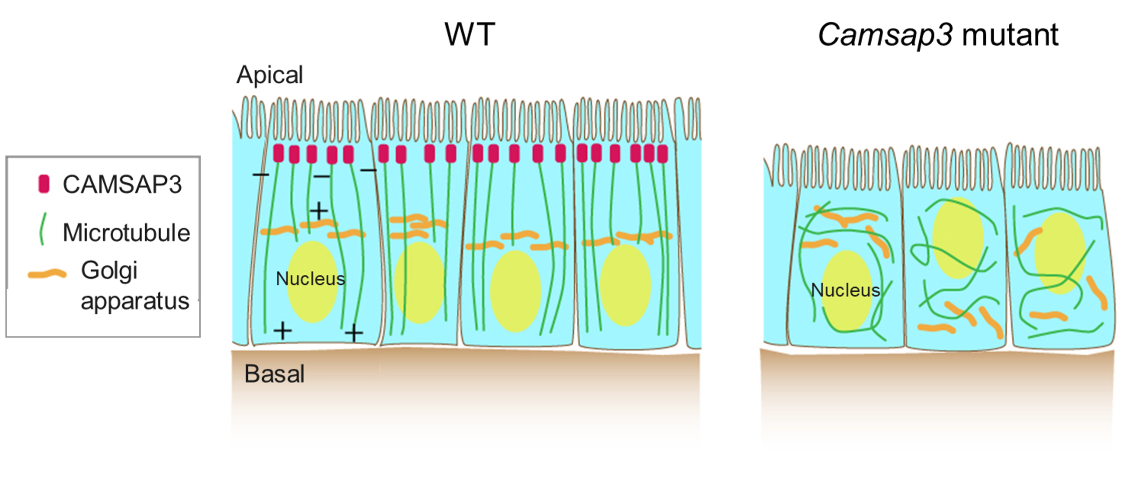 Cross sectional views of intestinal epithelial cells in WT (wild- type) and Camsap3 mutant mice are depicted. In WT, microtubules are aligned in a polarized manner along the apical-basal axis. This is because the CAMSAP3 protein tethers the minus end of microtubules at the apical surface. In the Casmap3 mutant mice, the orientation of each microtubule is randomized in the cytoplasm and, accordingly, the intracellular arrangement of cell organelles is severely affected.