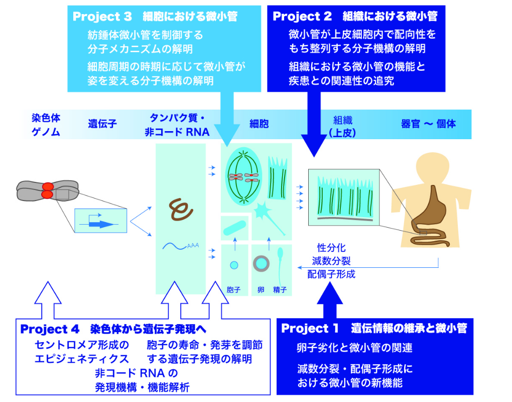 ではその過程において、細胞はどのような仕組みで分裂するのでしょうか? 体の組織はどのように作られるのでしょうか? 我々は細胞分裂と組織形成の分子メカニズムを探究することで、生命誕生の神秘に迫りたいと考えました。ここで特に、細胞の骨組みというべき「細胞骨格」(微小管・アクチン・中間径フィラメント) に着目し、細胞骨格がどのように細胞分裂と組織形成に役割を担うのかを解明すべく、研究を展開しています。