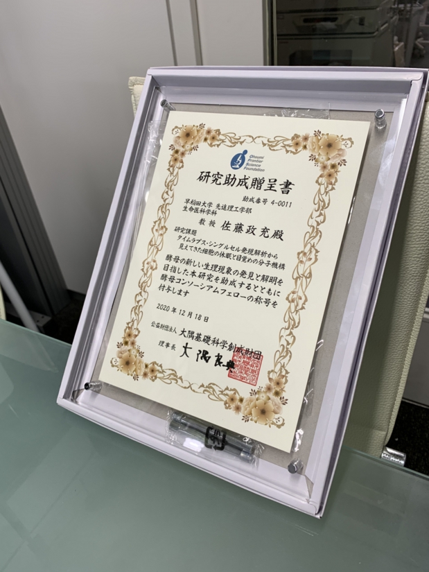 佐藤教授は、2020年度の受賞者として、東工大栄誉教授の大隅良典先生 (2016年ノーベル生理学・医学賞受賞) から「酵母コンソーシアムフェロー」の称号を付与されることになりました。